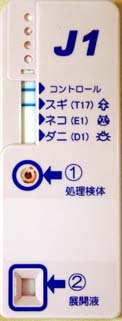 鼻にアレルギーがあるかどうかは、鼻水を検査すればわかりますが、それがスギの花粉でおきているかどうかまでは、わかりません。その原因を調べる方法の一つに、特異的IgE検査があります。すなわち、血中にスギ花粉に対する抗体が出来ているかを検査するのです。以前は、静脈から検査のために採血する必要がありましたが、最近は耳たぶから一滴くらいの血を採るだけで出来るようになりました。この写真では、スギのところに線が見えますが、このようになれば、血液中にスギ花粉抗体があることがわかります。この検査の場合、約20分で結果が出ます。 スギ花粉が原因であることが確定すれば、花粉防御マスクをはじめとした花粉グッズや、天気予報の花粉情報も有効に活用できるようになります。また、薬を飲むべき期間も、推測が出来ます。 |