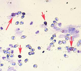 花粉症になっているかどうかの一番基本的な検査は、鼻にアレルギーが起きているかを調べることです。 このため、当院をはじめ耳鼻咽喉科の医療機関では、まず鼻水を綿棒でとって、ハンセル染色液で染色して、その場で顕微鏡で観察します。アレルギーが鼻にあれば、鼻水の中に好酸球という赤い顆粒を含んだ白血球が見つかります。矢印のついている細胞が、好酸球です。 鼻水は、水のように見えますが、たくさんの白血球を含んだ水です。ただの、水ではないのです。 |